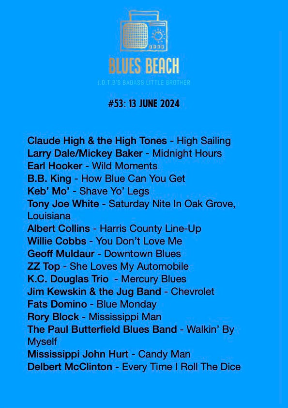It’s Blues Beach week again (it’s biweekly), with killer shuffles from Earl Hooker and Claude High & the High Tones, the original You Don’t Love Me from Willie Cobbs with Muddy Waters’ Sammy Longhorn on guitar, Larry Dale’s Midnight Hours with sensational Mickey Baker guitar and Champion Jack Dupree at the piano, the K.C. Douglas Trio’s Mercury Blues and Fats Domino’s version of Smiley Lewis’ hit Blue Monday. There are two Geoff Muldaur vocals, one with his ex wife Maria (but before they were married) on Jim Kweskin & the Jug Band’s Chevrolet and one on his own over thirty years later with Downtown Blues.