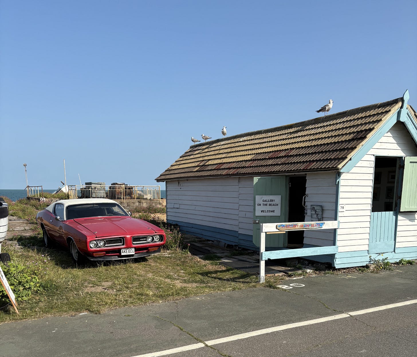 And finally….If you happen to be in Deal and walking along the seafront, take a look at Tom Burnham’s artwork at his Gallery on the Beach. It’s located on Walmer Green close to the Memorial Bandstand. Just look for Tom’s enormous classic Dodge Charger parked outside.